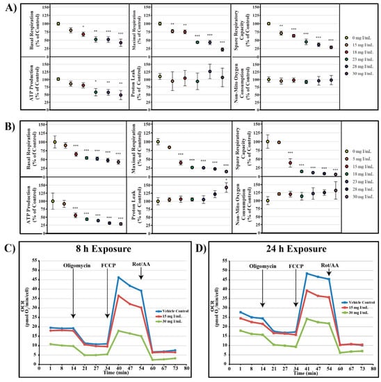 DA decreased basal OCR, maximal OCR, spare respiratory capacity, and ATP production at 8 and 24 h (Figure 3). OCR was decreased at 18 mg I/mL for basal OCR (p < 0.05), 15 mg I/mL for maximal OCR and spare respiratory capacity (p < 0.01), and 23 mg I/mL for ATP production (p < 0.05) when compared to vehicle control at 8 h; however, OCR linked to proton leak and non-mitochondrial oxygen consumption did not change (Figure 3). Basal OCR, maximal OCR, spare respiratory capacity, and ATP production were all significantly decreased at 15 mg I/mL (p < 0.001) within 24 h when compared to vehicle control (Figure 3). Similar to the 8 h timepoint, there was no change in non-mitochondrial oxygen consumption, although, there was an increase in OCR linked to proton leak at 30 mg I/mL (p < 0.05) when compared to vehicle control at 24 h (Figure 3) indicating damage to the mitochondrial inner membrane.