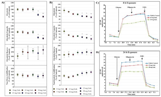 The cell glycolysis stress test utilizes extracellular acidification rate (ECAR) as an indicator of various parameters of glycolysis. HK-2 cells were starved of glucose and pyruvate for 40 min prior to glucose saturation and measurement of basal glycolysis. The ATP synthase inhibitor oligomycin was then injected to drive glycolysis to maximum capacity from which glycolytic capacity and glycolytic reserve could be calculated. ECAR linked to non-glycolytic acidification was determined by the addition of the hexokinase inhibitor, 2-deoxyglucose. Whereas decreases in OCR were evident at 15 mg I/mL at both 8 and 24 h, statistically significant decreases in glycolysis and glycolytic capacity as shown by ECAR were not apparent until 28 mg I/mL at 8 h (p < 0.05) and 23 mg I/mL at 24 h (p < 0.05) (Figure 4). Glycolytic reserve and non-glycolytic acidification were unchanged for all concentrations at both time points (Figure 4).