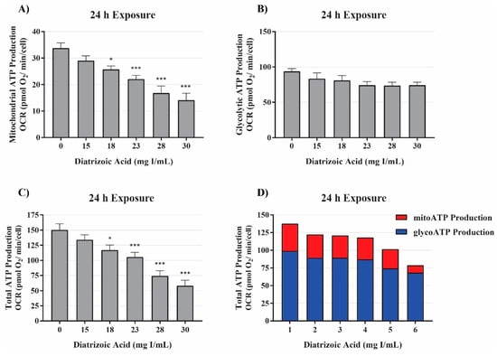 Diatrizoic acid effects on mitochondrial, glycolytic, and total ATP production. DA diminished ATP production linked to mitochondrial respiration (A) and total ATP production (C) but not glycolytic ATP production (B) following 24 h exposure. Representative graph of ATP production of the real-time ATP rate assay following exposure to DA for 24 h (D). Statistical difference from 0 mg I/mL DA depicted by an asterisk (* p < 0.05, *** p < 0.001). Values represent mean ± SEM for three independent experiments.