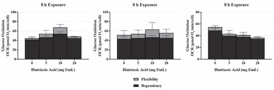 A decrease in mitochondrial function in the absence of damage to mitochondrial fuel oxidation may be partially due to a decrease in the total number of active mitochondria. Consequently, studies were conducted to evaluate the role of DA exposure on the expression of microtubule-associated proteins 1A/1B light chain 3B I and II (LC3BI and II). LC3BI was decreased by DA relative to control within 8 h at 18–30 mg I/mL (p < 0.05) and to 15–30 mg I/mL within 24 h (p < 0.05) (Figure 7 and Figure 8). LC3BII expression showed a trend to increase within 8 h of exposure to DA but was not statistically different (Figure 7). The increase in LC3BII expression did increase to significance within 24 h (p < 0.01) (Figure 8). However, the relative ratio of LC3BII/I was significantly increased (p < 0.05, p < 0.01) at both time points (Figure 7 and Figure 8). These findings suggest that the decrease in OCR observed in the cell mito stress could be due to mitophagy and not damage to the electron transport chain (ETC) or transport machinery. This conclusion was further supported by the results of the mito fuel flex test.