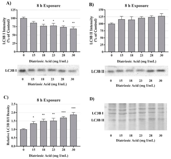 Diatrizoic acid effects on LC3B expression in HK-2 cells following 8 h exposure. DA induced mitophagy following 8 h exposure. Representative blots and cumulative densitometry included for LC3BI (A), LC3BII (B) exposure, and LC3BII/LC3B I ratio (C) following 8 h exposure to DA. Representative blot showing equivalent Memcode reversible stain for 40 µg loaded protein depicted for 8 h (D) exposure. Statistical difference from 0 mg I/mL diatrizoic acid depicted by an asterisk (* p < 0.05, ** p < 0.01, *** p < 0.001). Values represent mean ± SEM for three independent experiments.