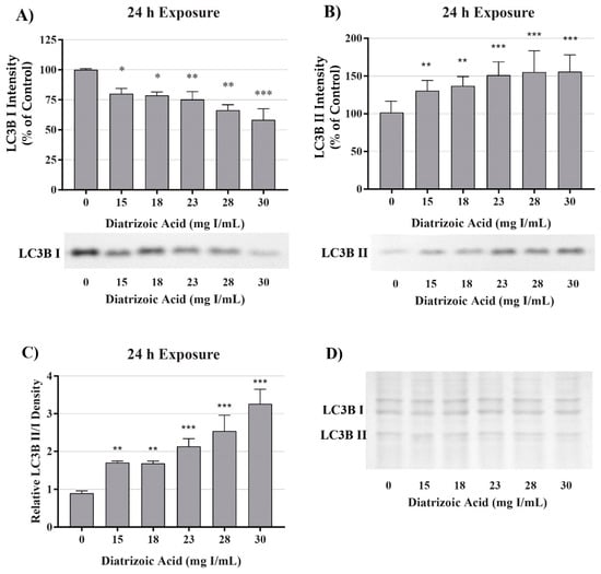 Diatrizoic acid effects on LC3B expression in HK-2 cells following 24 h exposure. DA induced mitophagy following 24 h exposure. Representative blots and cumulative densitometry included for LC3BI (A), LC3BII (B) exposure, and LC3BII/LC3BI ratio (C) following 24 h exposure to DA. Memcode protein staining of LC3BI and II blot loaded with 40 µg protein (D). Statistical difference from 0 mg I/mL diatrizoic acid depicted by an asterisk (* p < 0.05, ** p < 0.01, *** p < 0.001). Values represent mean ± SEM for three independent experiments.