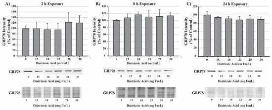 Disturbances in cellular homeostasis such as alterations in available ATP, redox status, and calcium regulation will result in misfolding or unfolding of proteins within the ER. Accumulation of misfolded or unfolded proteins within the ER activates the UPR and, if the instability is prolonged, will result in ER stress and apoptosis []. ER stress has been shown to play a role in a large number of pathophysiological disorders including the pathogenesis of ischemia/reperfusion injury and CI-AKI []. The role of ER stress has been established in HK-2 and NRK-E52 cells exposed to HOCM and LOCM has previously been established. NRK-E52 cells exposed to 60 mg I/mL DA or 100 mg I/mL iopromide resulted in significant increases in GRP78, phosphorylated RNA-dependent protein kinase-like ER kinase (PERK), phosphorylated eukaryotic translation initiation factor 2α (eIF2α), and CHOP expression [,]. HK-2 cells treated with 40 mg I/mL of DA induced statistically significant increases in GRP78, ATF4, CHOP, and caspase 12 mRNA levels []. However, studies in our laboratory concluded that exposing HK-2 cells with clinically relevant concentrations of DA could not induce significant increases in GRP78 expression or the downstream pro-apoptotic protein CHOP. These findings indicate that activation of UPR or ER stress does not play a role in the decrease in cell viability in response to DA exposure.
