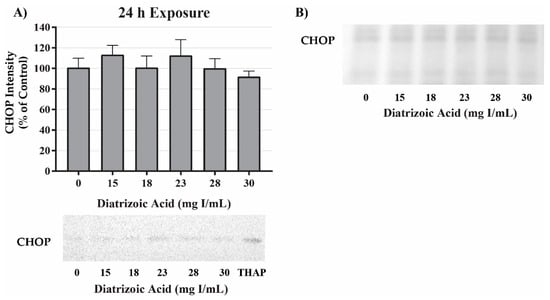 Diatrizoic acid effects on C/EBP homologous protein (CHOP) expression in HK-2 cells. DA did not induce ER stress. Representative blots and cumulative densitometry included for CHOP expression at 24 h (A). Panel (B) depicts Memcode reversible stain for 40 µg loaded protein. Positive control for CHOP expression was thapsigargin (THAP). Values represent mean ± SEM for three independent experiments.