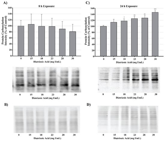 Diatrizoic acid effects on protein carbonylation in HK-2 cells. Carbonylated proteins were similar between control and DA treated cells at 8 h (A). DA at 18–30 mg I/mL increased protein carbonylation in cell lysate at 24 h (C). Memcode reversible stain for 15 µg protein depicted for 8 h (B) and 24 h (D) exposure. Statistical difference from 0 mg I/mL diatrizoic acid loading for gels is depicted by an asterisk (* p < 0.05, ** p < 0.01, *** p < 0.001). Values represent mean ± SEM for three independent experiments.