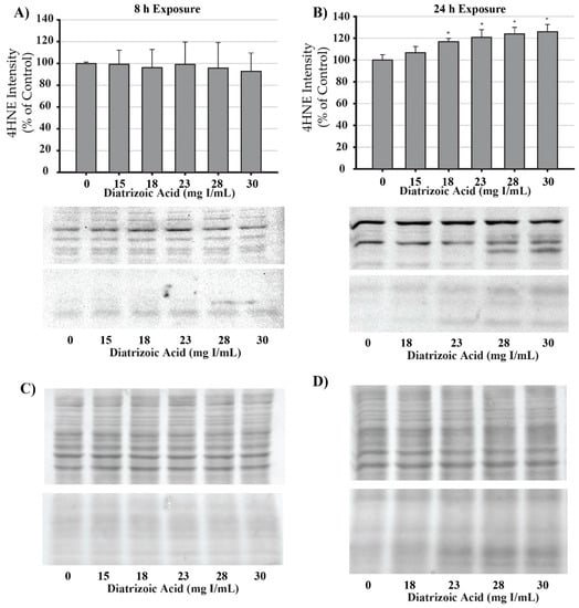 Diatrizoic acid effects on 4-hydroxynonenol (4HNE) adduct formation in HK-2 cells. An increase in 4HNE protein adduct formation was evident in cell lysate following 24 h exposure (B) to 18–30 mg I/mL. Positive bands of 4HNE were unchanged after 8 h (A) DA exposure. Panels (C) and (D) depict 8 h and 24 h, respectively, for protein loading of 40 µg per lane. Statistical difference from 0 mg I/mL diatrizoic acid depicted by an asterisk (* p < 0.05). Values represent mean ± SEM for three independent experiments.