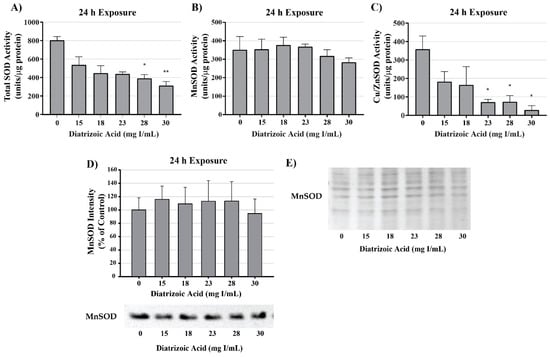 Diatrizoic acid effects on superoxide dismutase expression and activity in cellular fractions of HK-2 cells. Total superoxide dismutase (SOD) activity was decreased at 24 h by 28 and 30 mg I/mL (A). DA exposure did not change MnSOD activity (B) or protein expression (D). A decrease in Cu/Zn activity (C) was evident at 24 h exposure to 23–30 mg I/mL. Protein staining with Memcode (E) shown for blot visualizing MnSOD (D). Statistical difference from 0 mg I/mL diatrizoic acid depicted by an asterisk (* p < 0.05, ** p < 0.01). Values represent mean ± SEM for three independent experiments.