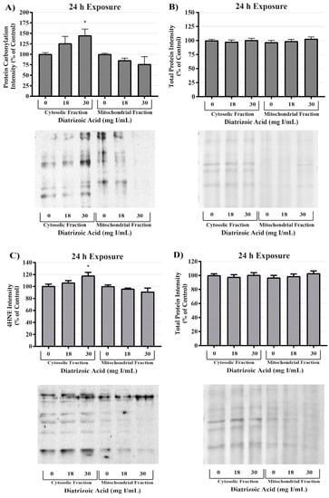 MnSOD expression was measured to determine the effect of DA exposure on antioxidant systems within the mitochondria. MnSOD expression was comparable between control and DA groups at 24 h (Figure 13). Protein expression levels do not necessarily indicate activity of an enzyme; consequently, MnSOD, Cu/ZnSOD, and total SOD activity were measured to evaluate the effects of DA on these important cellular antioxidant enzymes. Total SOD activity was decreased at 24 h relative to vehicle control in groups treated with 28 and 30 mg I/mL (p < 0.05) (Figure 13). MnSOD activity was unchanged in response to exposure to DA at 24 h (Figure 13), while Cu/ZnSOD activity was significantly reduced in response to 23 mg I/mL DA (p < 0.05) relative to vehicle control at 24 h exposure (Figure 13). Protein carbonylation and 4HNE adduction were measured in cytosolic and mitochondrial fractions to determine if MnSOD activity within the mitochondria is protecting HK-2 mitochondria from DA-induced ROS generation. Following exposure to 30 mg I/mL DA for 24 h, protein carbonylation and 4HNE protein adduction was significantly increased in response to control within the cytosolic fraction but there was no change in either biomarker of oxidative stress in the mitochondrial fraction (Figure 14).