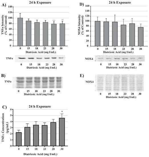 Diatrizoic acid effects on tumor necrosis factor alpha (TNFα) and NADPH oxidase (NOX4) expression in HK-2 cells. DA induced TNFα activation but did not affect downstream effectors. TNFα expression in cell lysate was decreased in response to 28 and 30 mg I/mL DA at 24 h (A). An increase in TNFα leakage into the cell media was evident at 24 h (C) with 30 mg I/mL DA. No significant change in NOX4 expression was apparent in cell lysate following 24 h (D) exposure to DA. Representative blot with Memcode reversible stain for 40 µg loaded protein depicted for TNFα (B) and NOX4 (E) following 24 h exposure. Statistical difference from 0 mg I/mL diatrizoic acid depicted by an asterisk (* p < 0.05, ** p < 0.01, *** p < 0.001). Values represent mean ± SEM for three independent experiments.