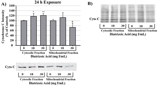 Diatrizoic acid effects on mitochondrial membrane integrity in HK-2 cells. DA diminished mitochondrial membrane integrity. Representative blot and cumulative densitometry for cytochrome c expression (A) in cytosolic and mitochondrial fractions following 24 h exposure to DA. Representative blot of protein staining to confirm equal 40 µg protein loading for cytochrome c (B). Asterisks (* p < 0.05, ** p < 0.01) indicate statistical difference from vehicle control in cytosolic fraction. Octothorpe (# p < 0.05) indicate statistical difference from vehicle control in mitochondrial fraction. Values represent mean ± SEM for three independent experiments.