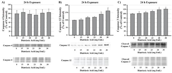 Diatrizoic acid effects on the expression of caspase 4, caspase 12, and caspase 3 in HK-2 cells. DA induced apoptosis via caspase 3 and caspase 12 activation. Representative blot and cumulative densitometry for total caspase 4 (A), caspase 12 (B), and cleaved caspase 3 (C) protein expression following 24 h exposure to DA. Asterisks (* p < 0.05, ** p < 0.01) indicate statistical difference from vehicle control. Protein loading reversible stain shown below respective protein. Each lane was loaded with 40 µg protein. Values represent mean ± SEM for three independent experiments.