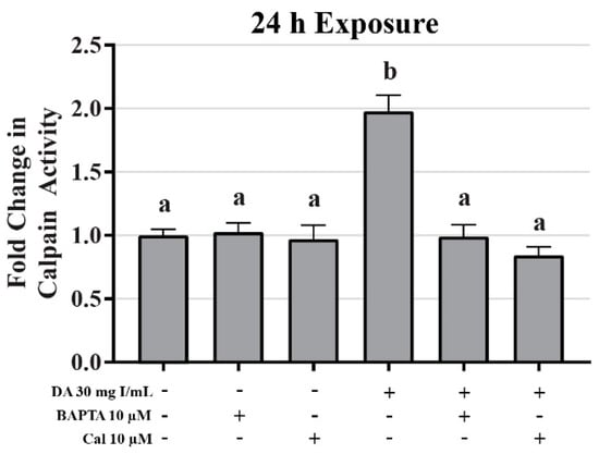 Diatrizoic acid effects on calpain activity in HK-2 cells. DA induced activation of calpain. HK-2 cells exposed to 30 mg I/mL DA for 24 h demonstrated a two-fold increase in calpain activity. Pretreatment with either 10 µM BAPTA-AM (calcium chelator) or 10 µM calpeptin (Cal; calpain pathway inhibitor) completely abrogated DA-induced calpain activity. Different superscripts (a,b) indicate a statistical difference between groups. Values represent mean ± SEM for three independent experiments of two biological replicants.