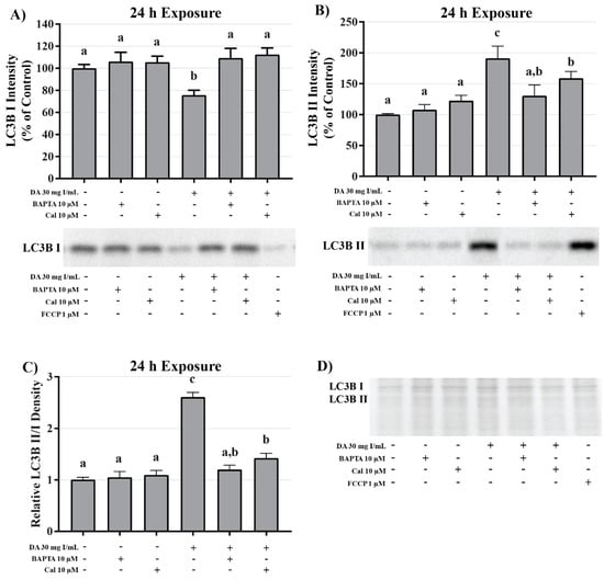 Effects of BAPTA-AM or calpeptin pretreatment on light chain (LC)3B expression in HK-2 cells. Pretreating HK-2 cells with BAPTA-AM or calpeptin attenuated DA-induced conversion of LC3BI to LC3BII. Representative blots and cumulative densitometry included for LC3BI (A), LC3BII (B), and LC3BII/LC3B I ratio (C) following 24 h exposure to DA. Protein loading stain depicted for 40 µg loaded pin (D). Positive control for LC3B conversion was FCCP (oxidative phosphorylation uncoupling agent). Different superscripts (a–c) indicate a statistical difference (p < 0.05) between group. Values represent mean ± SEM for three independent experiments of two biological replicants.
