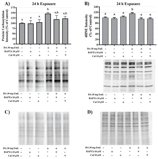 Effects of BAPTA-AM or calpeptin pretreatment on oxidative stress in HK-2 cells. Pretreatment with BAPTA-AM or calpeptin slightly decreased protein carbonylation and completely abrogated 4HNE adduct formation. Representative blots and cumulative densitometry included for protein carbonylation (A) and 4HNE adduct formation (B) following 24 h exposure to DA. Panel (C) depicts protein loading of protein carbonylation membrane and panel (D) depicts protein loading for 4HNE membrane. Different superscripts (a,b) indicate a statistical difference (p < 0.05) between groups. Values represent mean ± SEM for three independent experiments.