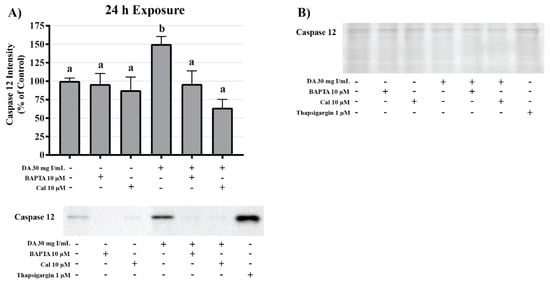 Effects of BAPTA-AM or calpeptin pretreatment on caspase 12 activity in HK-2 cells. Pretreatment with BAPTA-AM or calpeptin abrogated caspase 12 activation. Representative blots and cumulative densitometry included for caspase 12 (A) following 24 h exposure to DA. Representative blot with Memcode reversible stain for 40 µg loaded protein (B). Positive control for caspase 12 activation was thapsigargin. Different superscripts (a,b) indicate a statistical difference (p < 0.05) between various groups. Values represent mean ± SEM for three independent experiments.