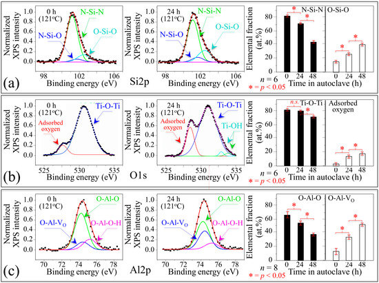 X-ray photoelectron spectroscopy (XPS) analyses of the investigated substrates before (left) and after (center) accelerated tests in water vapor environment, and plots summarizing elemental fraction results at different autoclaving times (right): (a) Si2p core spectrum of silicon nitride; (b) O1s core spectrum of Ti6Al4V alloy; and (c) Al2p core spectrum of alumina, with the related deconvolutions and quantitative time dependencies. Statistics were made according to the one-way Analysis of Variance (ANOVA) to assess the plots on the right side of each section.