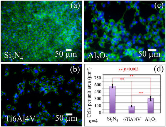 Figure 2 and Figure 3 summarize data collected by fluorescence microscopy and other biological assays, and laser microscopy data collected on KUSA-A1 mesenchymal cells exposed to different substrates. These figures also provide statistically data validations. The fluorescence micrographs in Figure 2 (nuclei and F-actin in blue and green, respectively) confirmed that the population of KUSA-A1 cells was clearly more numerous on the Si3N4 substrates after exposure times as short as 24 h, as seen in Figure 1a, while the number of cells was far lower on Ti6Al4V alloy substrates, as seen in Figure 1b, and relatively low on Al2O3 substrates, as seen in Figure 1c. The plot in Figure 2d quantitatively compares cell-counting data for 24 h exposure to different substrates.