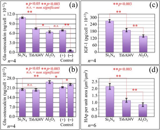 Assessments of differentiation and osteogenic metabolism in mesenchymal KUSA-A1 cells exposed for nine days to different substrates are given in Figure 3a–c. In Figure 3a,b, comparative plots of γ-carboxyglutamic (Gla)- and undercarboxylated (Glu)-osteocalcin, respectively, are given for cell-line exposure to different substrates. Statistically significant differences in concentration can be noticed in the Gla-osteocalcin plot, with the Si3N4 substrate reaching values more than one order of magnitude larger than and almost twice as those recorded for negative and positive control samples, i.e., cultured on silica glass without and with osteogenic medium, respectively, but otherwise under the same experimental conditions. The concentration of Gla-osteocalcin for mesenchymal cells exposed to the Si3N4 substrate was about 56% and 89% higher than those measured for exposures of cells to Ti6Al4V alloy and Al2O3 substrates, respectively. The Gla residue of osteocalcin is a specific and highly sensitive parameter for quantitative assessments of decarboxylated osteocalcin from the bony tissue produced by KUSA-A1 cells that differentiated into mature osteoblasts. Conversely, concentrations of the Glu residue, which is synthesized by osteoclasts, were the lowest in both Si3N4 and Ti6Al4V alloy substrates; no statistically significant difference between the two values was found but both were lower by ~40% and 30% than both positive and negative control, respectively. Note that the Al2O3 substrate experienced the lowest and the highest concentration of Gla- and Glu-osteocalcin supernatants, respectively, thus not only revealing the lowest propensity to osteoblastogenesis but also a conspicuous propensity for the mesenchymal cells to differentiate into mature osteoclasts.
