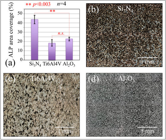 Figure 4a shows the results of alkaline phosphatase (ALP) staining while micrographs showing the black ALP stain on the Si3N4, Ti6Al4V, and Al2O3 substrates at nine-day exposure time are shown in Figure 4b–d, respectively. The ALP content of cells cultured on the Si3N4 substrate was about twice that of cells cultured on the Al2O3 substrate under the same conditions; cells on the Ti6Al4V substrate showed the lowest ALP concentration among the investigated samples (~20% lower than cell on Al2O3). However, there was no statistical difference between the ALP contents measured in cells cultured on these two latter substrates. ALP is an enzyme that represents cell differentiation and the present results prove that the KUSA-A1 cells differentiated faster on the Si3N4 substrate, a result in agreement with the IGF-1 results in Figure 3c.