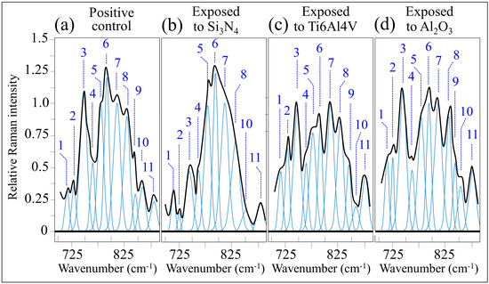 Low-frequency Raman spectra for (a) positive control cell sample, (b) cells exposed for 48 h to Si3N4 substrate, (c) cells exposed for 48 h to Ti6Al4V alloy substrate, and (d) cells exposed for 48 h to Al2O3 substrate. All the spectra were normalized to Band 7 (at 813 cm−1, related to symmetric stretching of the phosphodiester bonds of RNA [25,26,27]).