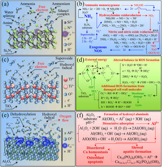 Schematic drafts of the free surface of different substrates in aqueous environment (Si3N4, Ti6Al4V alloy, and Al2O3 in (a,c,e), respectively) and the cascade of related off-stoichiometric reactions (Si3N4, Ti6Al4V alloy, and Al2O3 in (b,d,f), respectively).