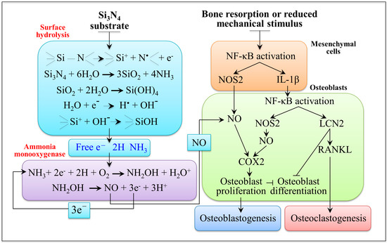 There are two distinct NF-kB pathways that lead to either osteoclastogenesis or osteoblastogenesis. The mechanisms according to which NF-κB can induce osteoclastogenesis downstream of receptor activator of nuclear factor-kappa B ligand/receptor activator of nuclear factor-kappa B (RANKL/RANK) are not yet completely understood. According to a recent study by Veeriah et al. [80], the osteoclastogenesis pathway could be described as follows: the pro-inflammatory cytokine IL-1β becomes active upon cleavage by caspase-1 and acts a pro-osteoclastogenic factor [80,81]. Ineffective in osteoblast proliferation, but active in reducing their differentiation, the pleiotropic and acute-phase protein Lipocalin 2 (LCN2) is upregulated by inflammation and its induction produces significant osteoblast impairment. LCN2 in turn stimulates RANKL production by osteoblasts, which favor osteoclastogenesis and bone resorption. Parallel to the IL-1β/LCN2/RANKL pathway, NF-kB activation also induces NOS2, which increases osteoblast proliferation through the formation of NO molecules that downstream target Cyclooxygenase-2 COX2 (NOS2/NO/COX2 pathway). Maintaining the balance between these two pathways is key for the metabolism of healthy bone. We have shown here that the Si3N4 surface could become an exogenous NO donor in aqueous solution as a consequence of the homolytic cleavage of its covalent Si-N bonds. NO molecules are generated from ammonia and its subsequent monooxygenase by means of free electrons made available by both silanol dissociation and by partially reduced oxygen radical byproducts that form as a consequence of leakage from transport chains of cytochrome c oxidase enzymatic catalysis in the mitochondrion. Such an amount of exogenously produced NO is expected to boost the NOS2/NO/COX2 pathway and to promote osteoblastogenesis, as seen in Figure 7. In a recent paper, Shen et al. [13,82] found that pH values >8 at the cell–substrate interface greatly enhance both cell proliferation and alkaline phosphatase activity of osteoblasts. This study is important because it shifts the focus in osteogenesis to the chemistry of the solid–liquid interface as a critical factor in bone regeneration. We have previously reported [48,49] that the interfacial pH at the cell/Si3N4 interface is locally enhanced and stabilized around a value ~8.25. This may be of importance in explaining the enhanced activity of mesenchymal cells on the Si3N4 surface; alkalosis is known to promote bone formation [83] while systemic acidosis promotes bone resorption [84,85,86].