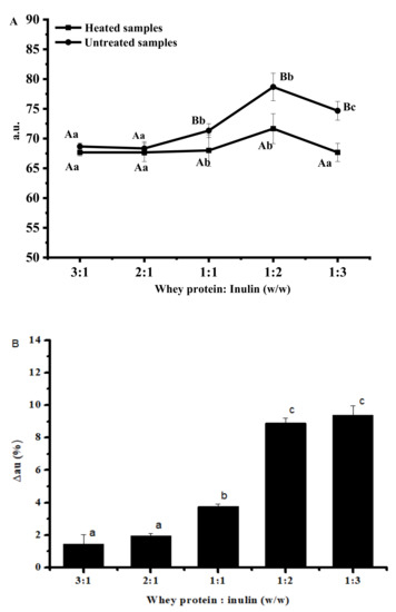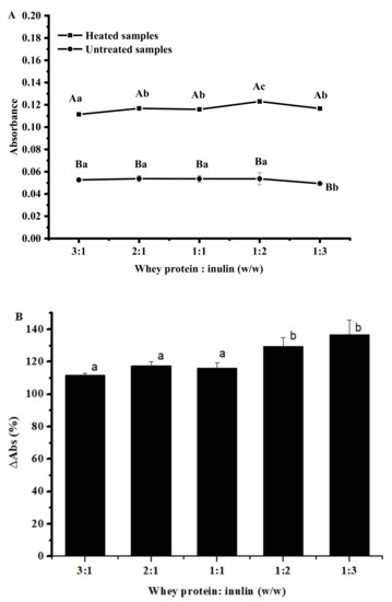 Browning intensity of heated and untreated whey protein and inulin mixtures (A) and changes in browning intensity of whey protein and inulin after heating (B). Different lowercase letters denote significant difference between samples at different ratios; Different uppercase letters denote significant difference between untreated and dry-heated samples at same whey protein and inulin ratio. Error bars are ± SD of the means.