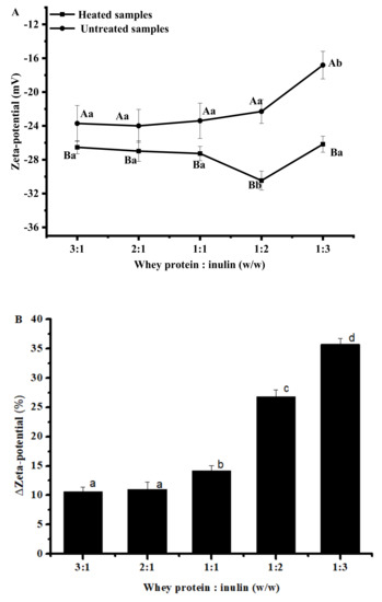 Zeta-potential of heated and untreated whey protein and inulin mixtures (A) and changes in zeta-potential of whey protein and inulin mixture after heating (B). Different lowercase letters denote significant difference between samples at different ratios; Different uppercase letters denote significant difference between untreated and dry-heated samples at same whey protein and inulin ratio. Error bars are ± SD of the means.