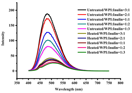 Whey proteins have been extensively used in the area for fabrication of nutrient delivery. However, the high surface hydrophobicity often led to destabilization of the delivery system [22]. Polysaccharides are hydrophilic macromolecules and can be used to conjugate with protein to improve the stability [23]. All samples are measured for surface hydrophobicity and the results are shown in Figure 4. The mixture of whey protein and inulin had lower fluorescence intensity after dry-heating compared with controls, suggesting that the surface hydrophobicity of whey protein could be suppressed by incorporating inulin into the polypeptide chains. Similar results have been reported that the surface hydrophobicity of whey protein could be reduced by conjugating with dextran [3]. The decreased surface hydrophobicity may be due to the shielding effect of the bound polysaccharide chain [24]. It can be also observed that the fluorescence emission maximum (λmax) of mixtures moved to a higher wavelength (red shift) after dry-heating. The wavelength of maximum fluorescence intensity for untreated samples were 481–485 nm while that for the dry-heated samples moved to 497–500 nm. 8-Anilino-1-naphtalene sulfonic acid (ANS) probes were used to measure the aromatic hydrophobicity of proteins. The red shift may be a consequence of the conformation changes in whey proteins which contains a high proportion of hydrophobic amino acid side chains due to the dry-heating induced interaction between whey protein and inulin [25]. Compared with untreated samples, 77.38%, 77.52%, 72.17%, 70.95% and 67.55% reductions in the maximum fluorescence intensity were noted for samples with ratios from 1:3 to 3:1, respectively, indicating that less binding sites available for fluorescence probe ANS may be buried with increasing ratio due to the interaction between inulin and whey protein [26].