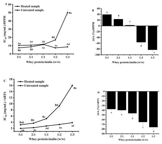 Changes in IC50 values of 2,2-diphenyl-1-picrylhydrazyl (DPPH) (A and B) and 2,2′-azinobis(2-ethylbenzothiazoline-6-sulfonate) (ABTS) (C,D) radical scavenging activities of whey protein and inulin mixture after dry heating. Different lowercase letters denote significant difference in IC50 values of DPPH or ABTS scavenging activities between samples with different whey protein and inulin ratios for untreated or dry-heated samples; Different uppercase letters denote significant difference in IC50 values of DPPH or ABTS scavenging activities between untreated and dry-heated samples at same whey protein and inulin ratio.