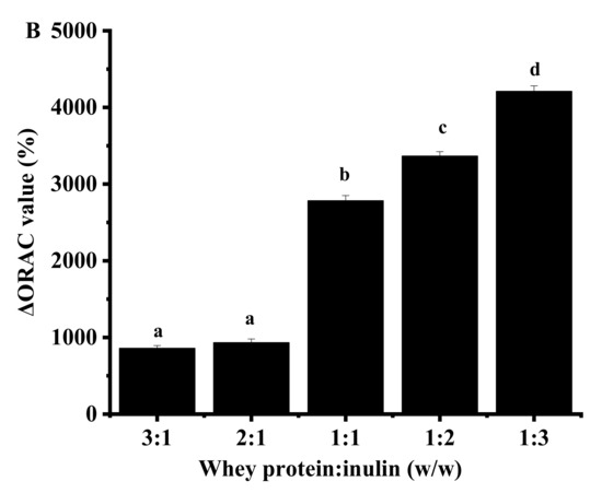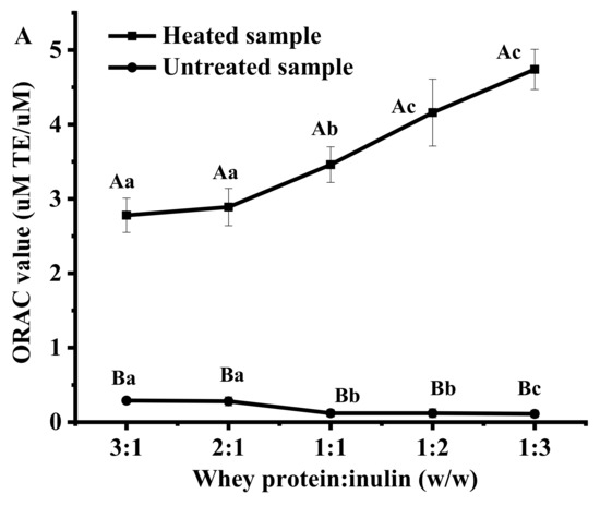Oxygen radical absorbance capacity (ORAC) values (µM TE/µM) of heated and untreated whey protein and inulin mixtures (A) and changes in ORAC value of whey protein and inulin mixture after heating (B). Different lowercase letters denote significant difference in ORAC values between samples with different whey protein and inulin ratios for untreated or dry-heated samples; Different uppercase letters denote significant difference in ORAC values between untreated and dry-heated samples at same whey protein and inulin ratio.