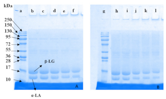 Protein profile of whey protein and inulin mixture before and after dry heating. (A) is untreated mixture and (B) is dry-heated mixture. a and g are Marker; b–f and h–l are samples at the ratios of whey protein to inulin of 3:1 to 1:3.