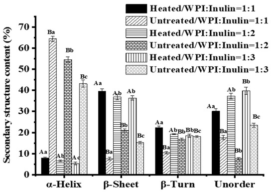 Secondary structures content (%) of whey protein in presence of inulin before and after dry heating. Different lowercase letters denote significant difference between samples with different whey protein and inulin ratios for untreated or dry-heated samples; Different uppercase letters denote significant difference between untreated and dry-heated samples at same whey protein and inulin ratio.