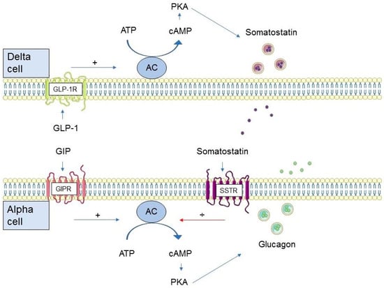 In rodents, the molecular basis for the glucagonotropic action of GIP on alpha cells has been shown to closely resemble the mechanism of GIP on beta cells, i.e., via an increase in intracellular cAMP concentration and activation of PKA (Figure 1) []. Studies in the perfused rat pancreas have confirmed that GIP stimulates glucagon secretion directly, while GLP-1 inhibits glucagon secretion in a somatostatin-dependent paracrine mechanism []. Human alpha cells have been found to express the GIPR []. Upon stimulation with GIP, both cAMP generation and glucagon secretion increased in a concentration-dependent manner which is supportive of a direct action of GIP on alpha cells [].