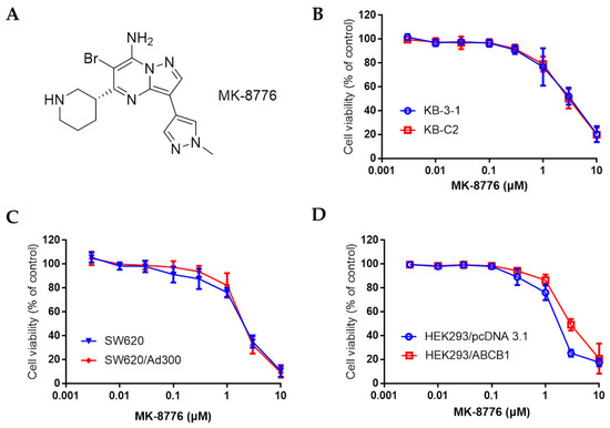 Recently, novel molecules such as natural products and many tyrosine kinases inhibitors (TKIs) are found to be P-gp modulators [17,18]. The combination of certain TKIs at non-toxic concentration with chemotherapeutics can reverse MDR via the suppression of the expression or inhibition of the efflux function of P-gp [13,19]. Checkpoint kinases (Chk), composed of two subtypes, Chk1 and Chk2, are mediators that play crucial roles in regulating DNA damage and the cell cycle by phosphorylating their substrate proteins, leading to the activation of DNA damage checkpoints, DNA repair, cell cycle transition, and apoptosis inhibition [20,21]. Activated by the single-stranded DNA or double-strand breaks (DSBs) of DNA, Chks, which are phosphorylated by ataxia telangiectasia mutated (ATM) and Rad3 related kinase (ATR), can promote the G2/M-phase and intra-S-checkpoints (Chk1), or evoke the p53-associated G1/S-phase checkpoint and S-phase cell cycle arrest (Chk2) [22], which in turn provide the time for DNA repair before allowing the cells with damaged DNA to perform mitosis [23]. MK-8776 (Figure 1A) is a Chk1 inhibitor in clinical trials for certain advanced solid tumors and acute myeloid leukemia [24,25]. MK-8776 works synergistically with radiotherapy and certain chemotherapy to combat human non-small lung cancer (NSCLC), leukemia and triple negative breast cancer via DSB repair inhibition, cell cycle arrest and autophagy inhibition [26,27,28]. In this work, we report that MK-8876 may restore the sensitivity of chemotherapeutics that are P-gp substrates to cancer cells that overexpress P-gp, suggesting its potential in circumventing P-gp-mediated MDR in cancer.
