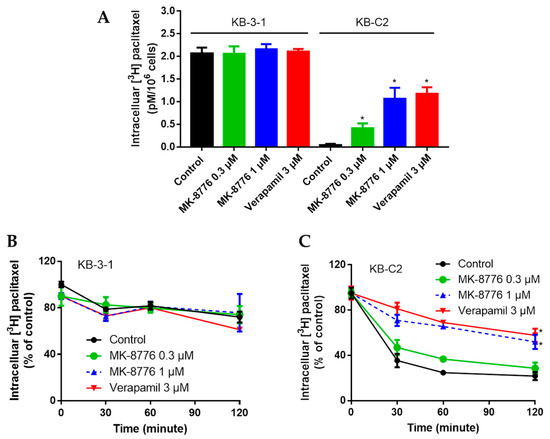 Effects of MK-8776 on the intracellular accumulation of [3H]-paclitaxel in KB-C2 cells that overexpress P-gp (A,C) and their parent KB-3-1 cells (A,B). * p < 0.05 vs. control.