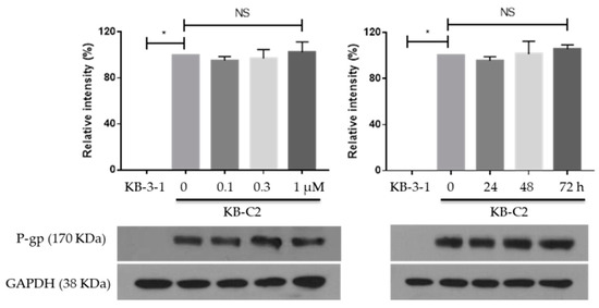 Effects of MK-8776 on P-gp expression in KB-C2 cells. * p < 0.05 vs. control. NS, not significant.