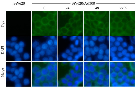 Since MK-8776 did not alter the P-gp expression in cells, we next tested the cellular localization of P-gp by immunofluorescence assay. SW620/Ad300 cells were treated with 1 μM of MK-8776 for 0, 24, 48, 72 h, and then P-gp was labeled by Alexa Fluor 488 dye. In this experiment, SW620 cells were used as a negative control, and DAPI was used to counterstain the nuclei.