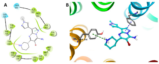 Docking study of MK-8776 with human P-gp. (A) The generated 2D figure of the docked position of MK-8776 within the P-gp crystal. The polar residues are indicated with cyan bubbles, and the hydrophobic residues are indicated with green bubbles. Furthermore, the cation–π bond in the figure is shown as red arrow, and the π–π interaction is shown as green line. (B) The enlarged 3D figure of the docked position of MK-8776 within the drug-binding site of human P-gp. The structure of MK-8776 is shown as a ball and stick mode with the atoms colored as follows: carbon with cyan, nitrogen with blue, bromine with dark red. The important residues of P-gp are shown as sticks, with the atoms colored as follows: carbon with grey, nitrogen with blue, oxygen with red, hydrogen with white. The cation–π bond is indicated with green dotted line. The π–π stacking interactions are indicated with a blue dotted line.