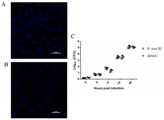 Infection and proliferation of B. suis S2 and ΔVceC in goat trophoblast cells (GTCs). (A,B) Representative confocal micrographs of GTCs infected with B. suis S2 (A, red) and ΔVceC (B, red) at 24 h post infection. The data shown are representative of three independent experiments. (C) Intracellular survival in GTCs of wild type (B. suis S2, circle) and the mutant obtained (ΔVceC, square). The results are expressed as the means ± standard deviation from three independent experiments at each time point.