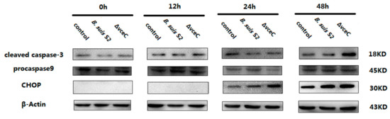 Because ΔVceC infection increased cells’ early apoptosis, we measured cleaved caspase-3 (the marker of apoptosis), procaspase-9 (the marker of mitochondrion-induced cell death), and CHOP (the marker of ER stress-induced cell death) expression by Western blot at different times (Figure 3). At 48 h, cleaved caspase-3 expression was enhanced after ΔVceC infection compared with the B. suis S2 infected group. However, cleaved caspase-3 expression was not significantly different at 0, 12, and 24 h among the uninfected group, ΔVceC-infected group, and B. suis S2-infected group. Caspase-9 expression was also not significantly different at 0, 12, 24, and 48 h among the uninfected group, ΔVceC-infected group, and B. suis S2 infection group. Furthermore, CHOP expression was increased at 24 and 48 h after ΔVceC infection compared with the B. suis S2 infection group, but no significant difference was found at 0 and 12 h. According to our Western blot analysis, cleaved caspase-3 expression at 48 h, as well as CHOP expression at 24 h and 48 h, was more strongly induced in the ΔVceC infection group than in the B. suis S2 infection group. The results suggested VceC is involved in Brucella-mediated apoptosis through the UPR signaling pathway.