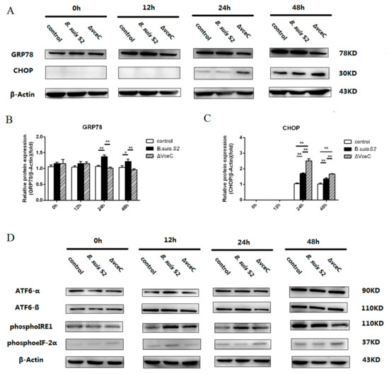 The unfolded protein response (UPR) pathway is induced by B. suis S2 and ΔVceC. (A) GTCs were infected with 100 MOI of B. suis S2 and ΔVceC for 0 h, 12 h, 24 h, and 48 h, and the untreated group was used as a negative control, followed by lysis and detection of GRP78 and CHOP protein expression by Western blot. The data shown are representative of three independent experiments. (B,C) Quantification of band intensities from three independent results was determined by densitometric analysis. Data represent the mean ± standard deviation from three independent experiments at each time point.* p < 0.05; ** p < 0.01 (D) GTCs were infected with 100 MOI of B. suis S2 and ΔVceC for 0, 12, 24, and 48 h, and the untreated group was used as a negative control, followed by lysis and detection of ATF6-α, ATF6-β, phosphoIRE1, and phosphoeIF-2α protein expression by Western blot. The data shown are representative of three independent experiments.