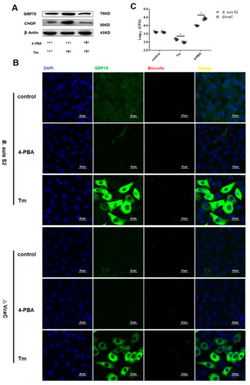 The process of the B. suis S2 infection assays was carried out as described previously. Briefly, GTCs were seeded in 6-well plates (5 × 105 cells per well) or in 24-well plates (1 × 105 cells per well) and were infected with B. suis S2 or ΔVceC at a multiplicity of infection of 100:1. After 4 h of incubation at 37 °C with 5% CO2 atmosphere, GTCs were washed three times with PBS and then further cultured with cell culture medium containing 50 µg/mL kanamycin to eliminate B. suis S2 or ΔVceC adhering to the GTCs and in the culture medium. After 1 h, the GTCs were washed three times with PBS and were further cultured with cell culture medium containing 25 µg/mL kanamycin to avert continuous infection. This point in time was considered 0 h and the time point of treatment with Tm (ER stress activator) and 4-PBA (ER stress antagonist). The cells were collected, and relevant experiments were performed at specific times (0, 6, 12, 24, and 48 h).