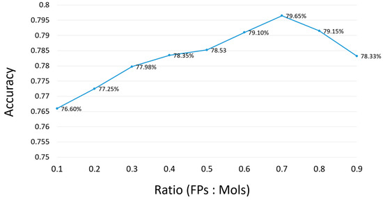In order to improve the accuracy of the model, seven key physicochemical properties were used, which were widely adopted in chemical toxicity prediction [6,11,12]. Then the weight of the molecular descriptors and fingerprints was further investigated. Figure 3 illustrates the accuracy of model in terms of the threshold of the weight. From Figure 3, it can be seen that the best weight is 7:3 to tradeoff molecular fingerprints and molecular descriptors, The detailed information can be seen in Supplementary 6.