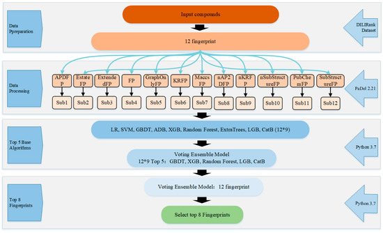 To build the ensemble system, first, dataset with instances encoded by each fingerprint was input into each base type of classifiers. Therefore, 108 classifiers were built with 12 molecular fingerprints based on 9 machine learning algorithms. To vote among the nine base classifiers, the top 5 base classifiers with better prediction performance were obtained, similarly, the top 8 of 12 fingerprints were obtained. Figure 4 shows the flowchart of the ensemble classifier system.