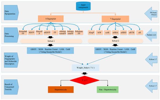 Figure 5 shows the flowchart of ensemble model. First, the top 8 molecular fingerprints were used as a subset, and 7 molecular descriptors as the second subset, using an ensemble vote classifier method to calculate the weight ratio of molecular fingerprints and molecular descriptors. The default threshold for our model was set to 0.5, which means that compounds with a hepatotoxic probability greater than 0.5 will be classified as hepatotoxic, otherwise, nonhepatotoxicants.