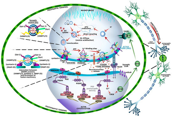 There is extensive data indicating that disturbances in proteins that are involved in maintaining proper synapse structure, distribution, release of SVs, as well as in synaptic transmission (e.g., VAMP1/2, Syntaxin-1, SNAP-25, Syp, Syt-1, PSD-95, and other scaffold proteins of the MAGUK or Shank families) are common molecular mechanisms underlying synaptic pathology, neuronal dysfunction, and cognitive disorders that are observed in both neurodegenerative and neurodevelopmental diseases, i.e., autism spectrum disorders (ASD), schizophrenia, and AD [82,83,84]. Changes in the concentration and activity of neurotrophins, especially BDNF, are also of key importance in the pathogenesis of neurodegenerative diseases (AD, Parkinson’s disease (PD), Huntington’s disease, dementia) and neurodevelopmental disorders (ASD) [85]. BDNF deficiency is observed in neurons that are rich in neurofibrillary tangles (NFTs) in AD, while disorders in its synthesis are associated with mutations of α-synuclein protein (ASN) in the hereditary form of early onset PD [86,87,88]. A decrease in BDNF concentration is also observed in schizophrenia, which suggests the involvement of this factor in the disease etiology [89]. It was found that synapse degeneration is the main manifestation of pathology observed in various forms of dementia, especially in AD [90]. There is also evidence to support the important role of synaptic protein-coding genes in the pathophysiology of ASD. The identification of mutations in numerous genes encoding proteins important for synapse formation, maturation, and stabilization (i.e., presynaptic neurexins (NRXN1, NRXN2, NRXN3), their postsynaptic neuroligin ligands (NLGN1, NLGN3, NLGN4X, NLGN4Y), as well as the family of SHANK proteins found in the PSD (SHANK1, SHANK2, SHANK3)) have indicated synapses as the central players in determining ASD susceptibility [91,92,93,94,95].