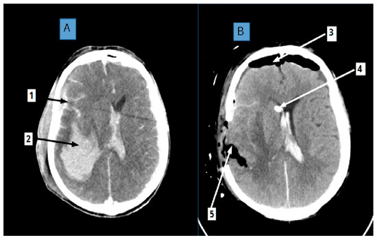 56 years old male, a victim of craniocerebral trauma (CT) due to assault. Assessment upon admission rated him at a 3 GCS (Glasgow Coma Scale) without autonomic respiration. CT A: showing huge intracerebral hematoma in right hemisphere (arrow 2) surrounded with edematous area. Subarachnoid hemorrhage (arrow 1) as well as intraventricular blood clot. Right-sided craniectomy was performed and hematoma evacuated. Intraventricular external drainage was installed. CT B: shows postoperative cavity with air remnants (arrow 5), intraventricular catheter tip in right frontal horn is also seen (arrow 4). Air in subarachnoid space in frontal region is present due to brain volume reduction (arrow 3). Noteworthy is that the shift of medial line structures is less advanced compared with CT A taken before surgery. The patient survived with the GOS (Glasgow Outcome Scale), which might be related to the early application of decompressive techniques e.g., craniectomy and increased CSF outflow causing more adequate perineuronal net geometry. The study was conducted in accordance with the Declaration of Helsinki, and the Bioethical Commission of Pomeranian Medical University in Szczecin, Poland, approved the protocol (permission numbers KB-0012/156/17).