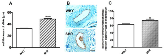 Measurement of medial width (A), representative micrographs (B) and intensity of the immunohistochemical reaction for the von Willebrand factor (vWF) (C) in the small mesenteric arteries (sMAs) from normotensive Wistar Kyoto rats (WKY) and spontaneously hypertensive (SHR) rats. Mean ± SEM of n = 4–5 animals for each bar (A,C); * p < 0.05, *** p < 0.001, compared to the WKY; bar = 50 μm.