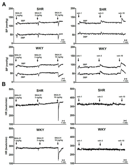 Traces from representative experiments showing the influence of SKA-31 (1, 3, or 10 mg/kg i.v.) or its vehicle (veh-1, veh-3, or veh-10, respectively) on (A) diastolic blood pressure (DBP) and systolic blood pressure (SBP) or (B) heart rate (HR) in urethane-anaesthetized spontaneously hypertensive rats (SHR) and Wistar Kyoto rats (WKY). Arrows show the moment of injection of the of SKA-31/veh.